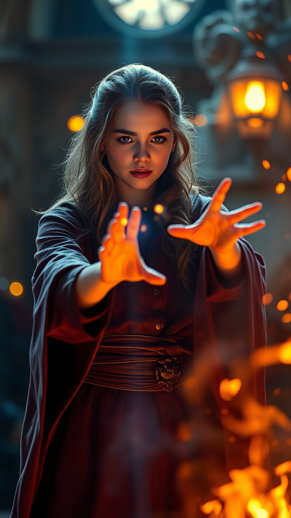 A stunning young female wizard, skillfully casting spells at the center of the scene, surrounded by glowing embers and a bokeh effect, with a striking lens flare and light bloom enhancing the cinematic lighting. The composition features a shallow depth of field, presented in HDR with ultra high-detail and vibrant colors. The image intriguingly lacks visible arms or hands, and has a subtle, almost ethereal watermark effect, adding an air of mystery to the enchanting scene.
