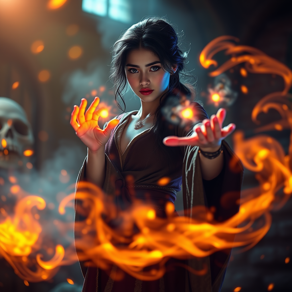 A stunning young female wizard stands gracefully, casting mystical spells with swirling embers surrounding her. Her presence is enhanced by the rich cinematic lighting and mesmerizing bokeh effect, creating an ethereal atmosphere. The intricate details are captured in ultra high-definition, with vibrant colors and high saturation, bringing her character to life. A magical lens flare and soft light bloom add to the enchanting scene, while the depth of field draws focus to her skillful magic. Despite her mystical prowess, there's an intriguing illusion of missing arms and hands, creating a mysterious aura. An unintended watermark hints at a captured moment from a mythical world.