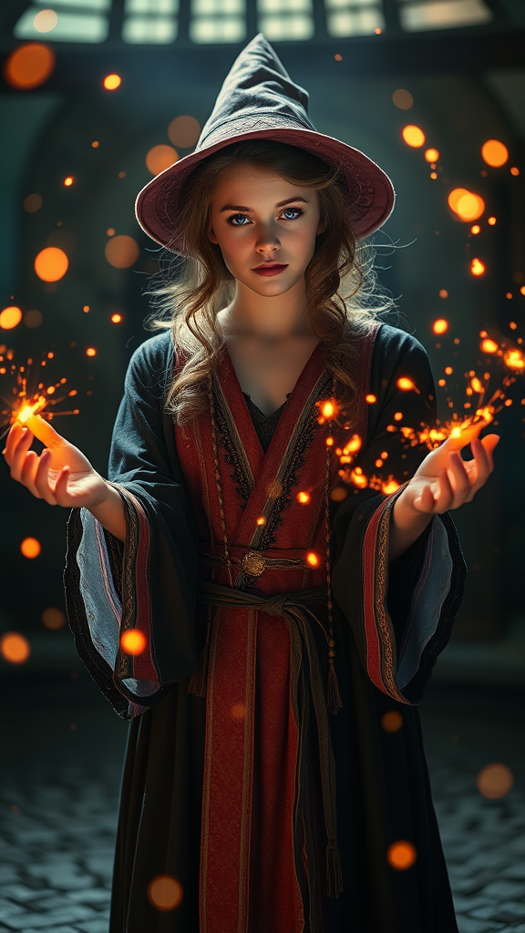 A stunning young female wizard stands in the center, her presence radiant as she casts intricate spells. Embers dance around her in the air, creating a mesmerizing display against a backdrop of bokeh. The scene is enhanced by cinematic lighting that exudes a magical lens flare and a gentle light bloom, adding depth to every detail. The high dynamic range (HDR) technique ensures ultra high-detail and vibrant high saturation, bringing the scene to life. In a charming twist, her arms and hands appear ethereal, as if cloaked in mystery, while a subtle watermark serves as an artist's signature in this enchanting portrait.
