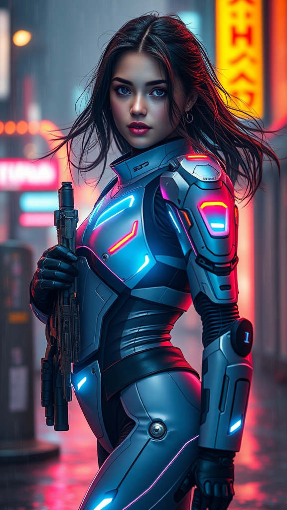 A stunning young girl, embodying the essence of a goddess, dressed in sleek sci-fi medium armor illuminated with neon lights. She possesses striking white eyes and stands confidently with a cyberpunk flair, exuding readiness for action. The scene captures an urban setting in slow motion, with rain and atmospheric fog creating dramatic reflections. Her dynamic posture is complemented by a futuristic sci-fi laser gun and a perfectly symmetrical face showcasing a confident smile. Her figure is enhanced by the contrast of latex elements, a nod to a futuristic army uniform reminiscent of Star Wars, evoking a sense of nostalgia. Her hair flows dynamically, illustrating a fusion of intricate details, HDR brilliance, and photorealistic skin. Lens flares punctuate the digital canvas, making the art highly detailed and trending on platforms like ArtStation and CGSociety. A masterpiece by visionary artists like Artgerm, Greg Rutkowski, and Viktoria Gavrilenko, the piece conveys a blend of dramatic realism and the vibrant essence of a futuristic world. Despite its vivid storytelling, the scene retains a clarity that avoids imperfections and distortions, presenting a seamless and awe-inspiring depiction.