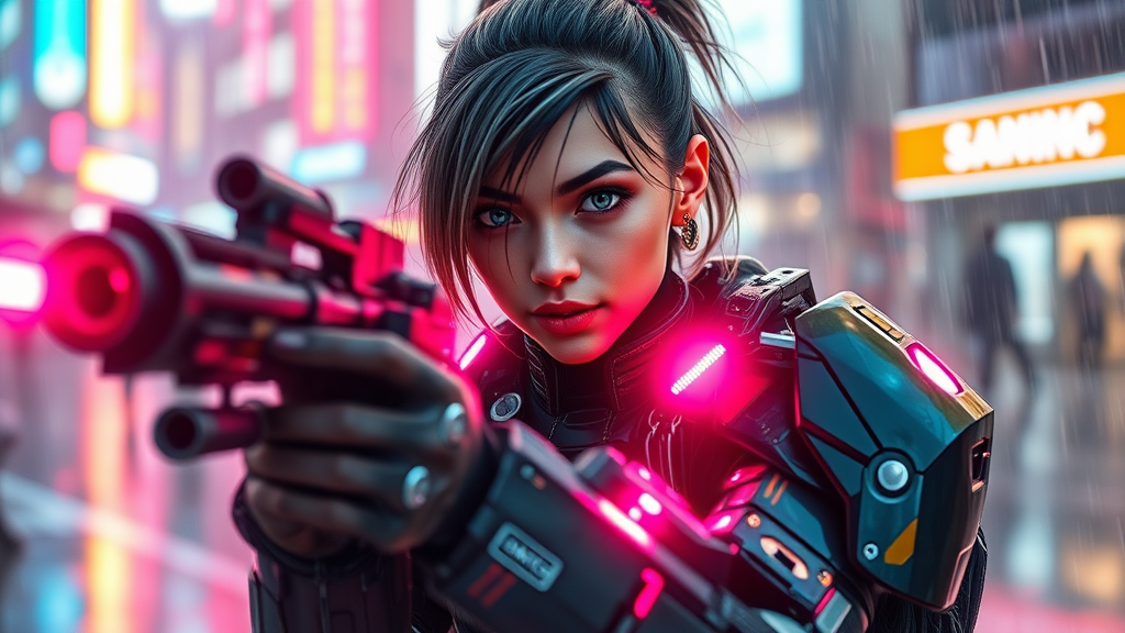 A stunning young girl, radiating beauty, embodies a futuristic goddess wearing sleek sci-fi medium armor adorned with glowing neon accents. Her eyes, a striking white, exude an otherworldly allure as she moves through a rain-soaked urban landscape in slow motion. Neon lights reflect off her armor, enhancing the bloom effect that envelops her whole form. She stands in a dynamic posture, brandishing a sci-fi laser gun with latex-clad hands. Her face, perfectly symmetrical, carries a confident smile. This cyberpunk warrior appears poised for battle, enveloped in fog and reflections adding depth and mystery to the scene. The intricate details of her Star Wars-style futuristic army uniform evoke nostalgia, while her dynamic hairstyle adds to her dramatic presence. Rendered in HDR, her photorealistic skin gleams with authenticity, as lens flares add cinematic flair. This captivating image, trending on platforms like ArtStation and CGSociety, features art by masters like Artgerm, Greg Rutkowski, and Viktoria Gavrilenko. The artwork balances elements of cartoonish charm and detailed realism, crafting a compelling vision of a vibrant cyberpunk future.
