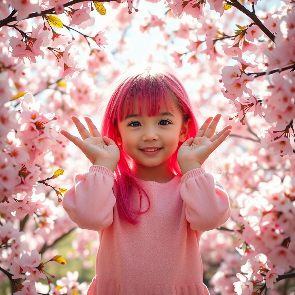 A stunning young girl stands amidst a sea of blooming cherry blossoms, her pink hair catching the dappled sunlight in a dynamic, centered composition. The scene is intricate and highly detailed, with vibrant colors enhanced by soft, volumetric lighting that accentuates the beauty of the flowers and the freshness of spring. The atmosphere is enchanting, with the sunlight filtering through the branches casting playful shadows around her. Although she holds her hands up playfully, her expression is one of serene joy, embodying the innocence and wonder of youth. The image is high quality, capturing every detail crisply, from the delicate petals of the blossoms to the gentle expression on her face.