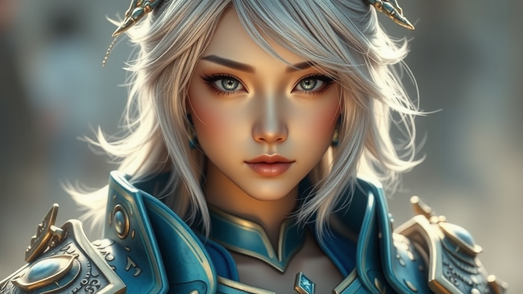 A stunning young South Korean girl with medium-length silver hair and a toned midriff, adorned in elaborate azure armor, her face is beautifully detailed, exuding elegance and strength.