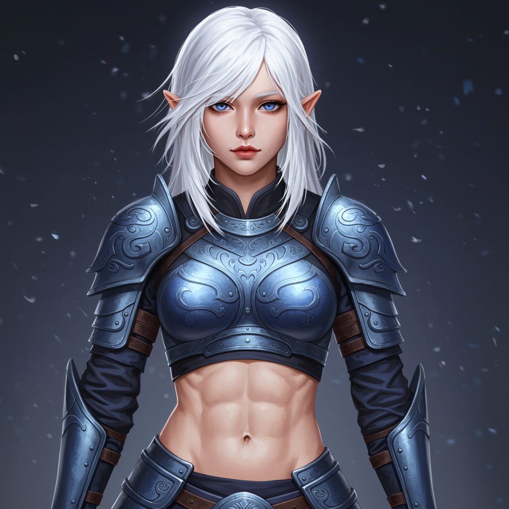 A stunning young South Korean girl with medium-length white hair stands confidently, her intricate azure armor glistening in the light. Her detailed, gorgeous face exudes a captivating allure, while her toned stomach is revealed by her midriff-baring ensemble, showcasing a blend of strength and elegance. Subtle modifications in the armor's design highlight her unique sense of style, blending tradition with a modern twist.