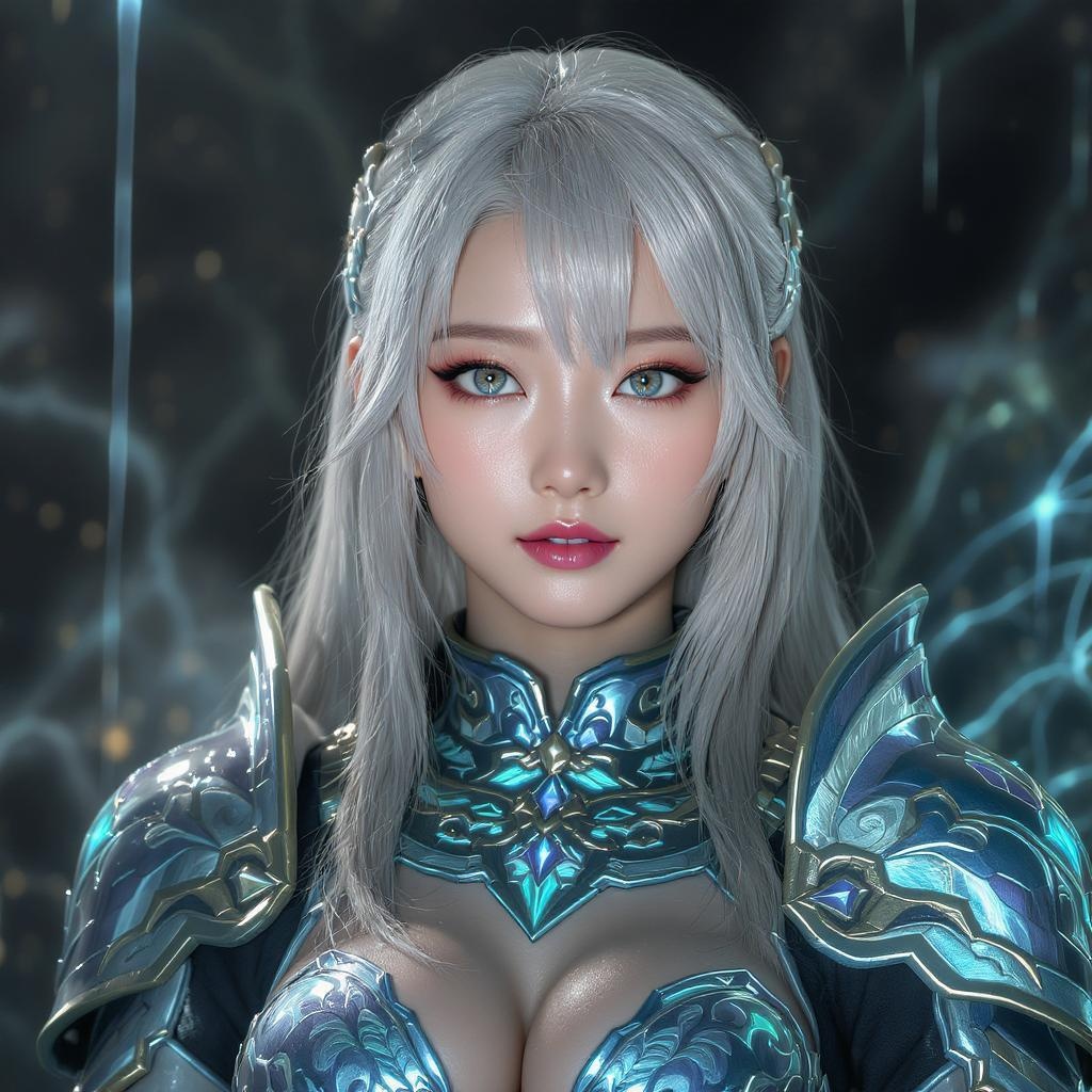 A stunning young South Korean girl with medium-length silver-white hair frames her detailed and strikingly beautiful face. Her piercing eyes are highlighted by subtle, luminous makeup that enhances her natural beauty. She wears elaborately crafted cerulean armor that glows with an ethereal light, its ornate patterns intertwining in a mesmerizing dance of artistry. The armor's design elegantly exposes her toned midriff, showcasing both strength and grace. Her expression is one of serene confidence and poise, hinting at a spirit both fierce and gentle. The setting is captured in hyperrealistic detail reminiscent of Greg Rutkowski's vivid style, creating an image that's both stunningly lifelike and richly imaginative.
