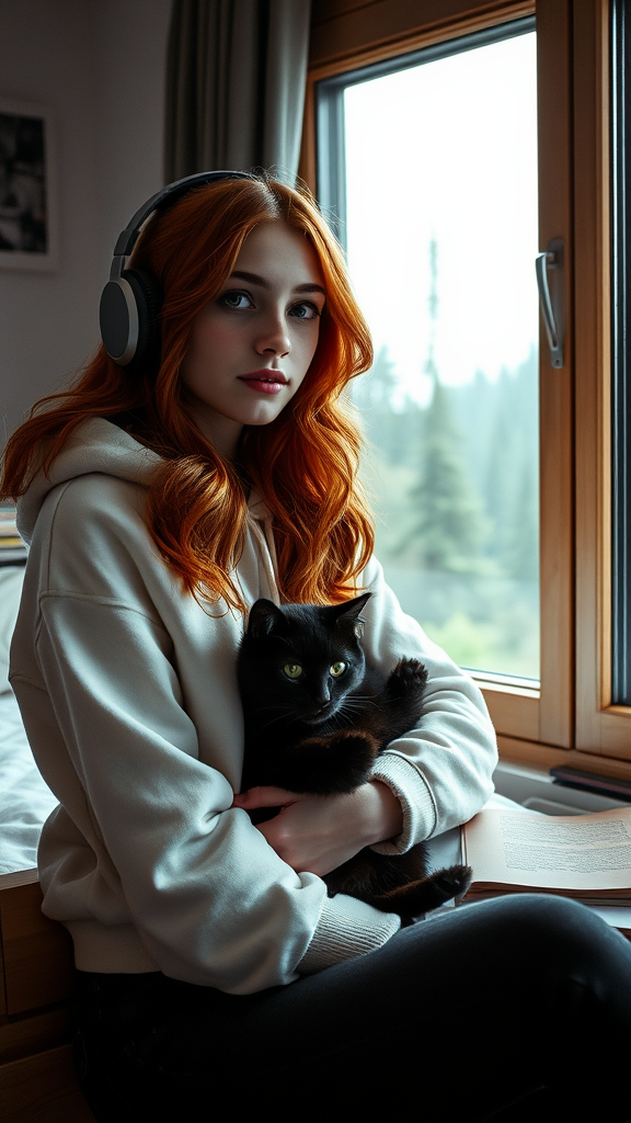 A stunning young Swiss girl sits by a window, headphones on, surrounded by books. She wears a cozy white hoodie and black jeans, her red hair cascading in medium-length waves. Her neon eyes and smooth features give her an ethereal look, with thin lips and a delicate nose. The girl gazes thoughtfully out the window and occasionally at the camera, a black cat nestled in her lap. Behind her, a bed is partially hidden by a stack of books. The open window offers a view of a tranquil forest, bathed in soft, natural lighting. Captured in muted tones, the photograph exudes a magical and intimate atmosphere, showcasing dramatic yet realistic portraiture. Shot with an 85 mm lens, the image boasts photorealistic details and an artistic composition, reminiscent of magic photography captured with a Cinestill 800T film, creating a mysterious and mystical ambiance.