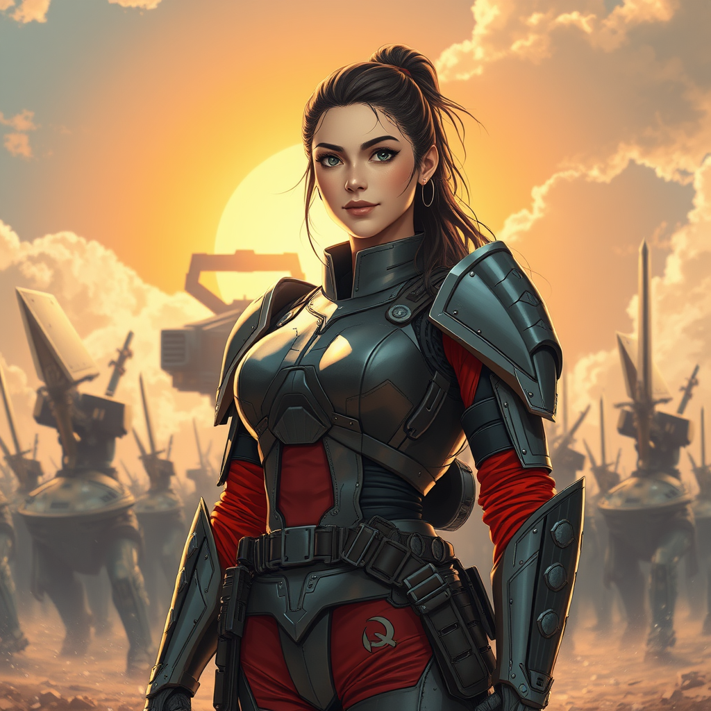 A stunning young woman adorned in sleek futuristic warrior armor stands proudly, embodying the strength and spirit of a heroine from a Soviet-era poster. Her striking outfit, reminiscent of classic USSR designs, is complemented by an array of swords and firearms gracefully displayed in the backdrop. Behind her, an epic mech war unfolds under a bright, sunny sky, infusing the scene with a vibrant energy. The artwork captures the essence of anime and manga graphics, richly detailed in dark hues and realized with the precision of offset printing. The atmosphere is one of hope and resilience, enhanced by natural lighting that highlights her confident smile. Rendered in ultra-high definition, this composition delivers an immersive 8K experience in CMYK colors that resonate with a harmonious blend of historical and futuristic themes.