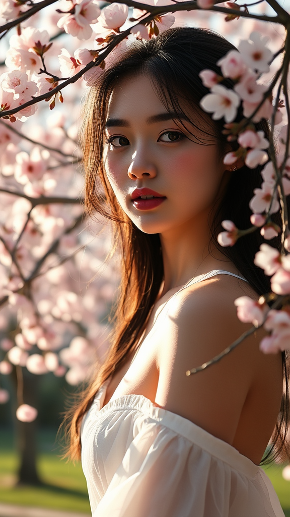 A stunning young woman amidst a tranquil outdoor scene featuring blossoming sakura trees, illuminated by dramatic natural light. Captured as a high-detail RAW color photo, this professionally shot image reflects realism with a focus on hyper-realistic textures and rich, vibrant colors. This ultra-high resolution artwork, designed for CGI and 8K wallpapers, showcases intricate detail through physics-based rendering. The scene blends elements of digital art and photography, capturing the essence of hyperrealism with the finesse of a professional f1.6 lens. The overall composition is artistic and vivid, encapsulating the beauty of nature and human form in perfect harmony, free of any distortions or imperfections.