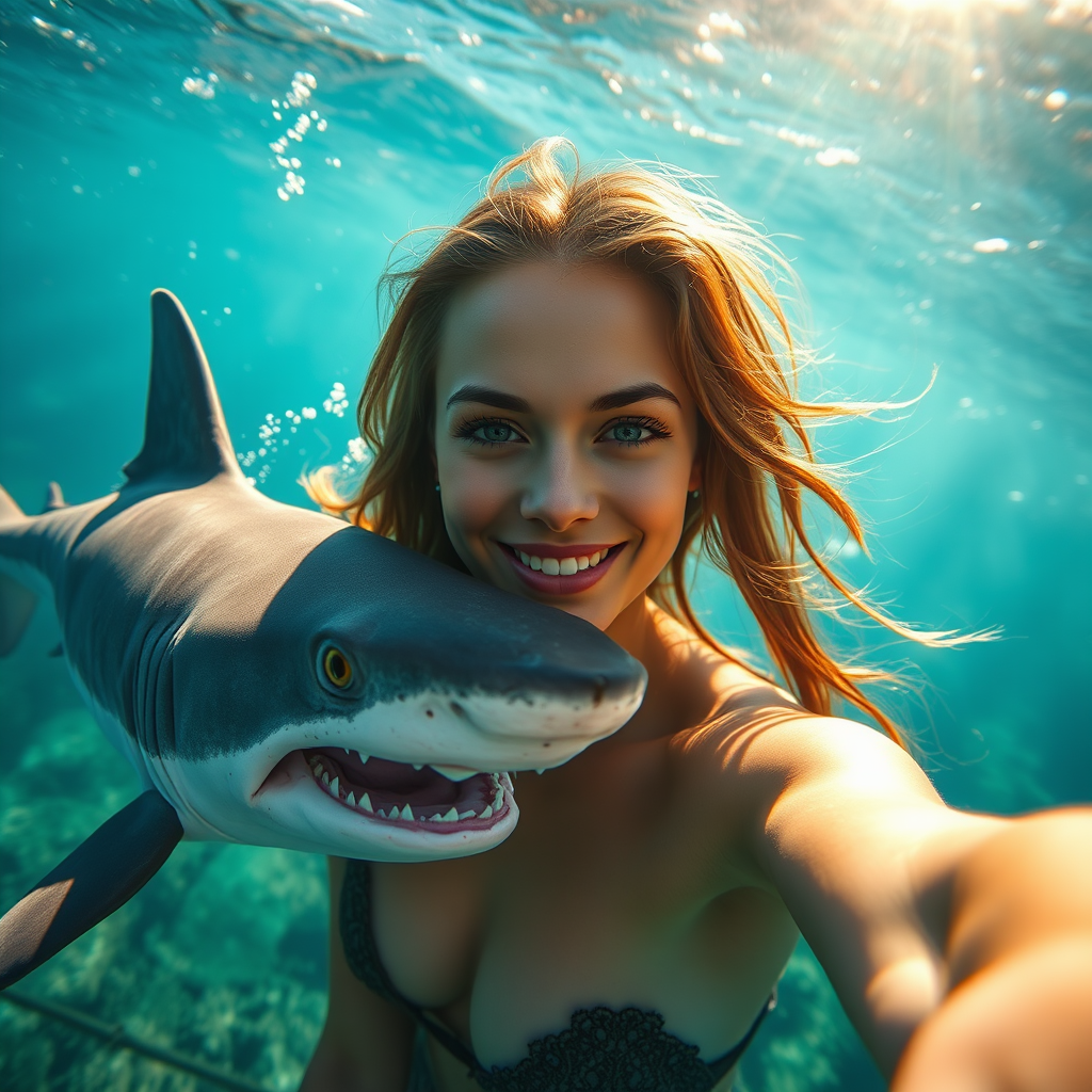 A stunning young woman captures a selfie beside a curious, hungry shark within a vibrant, sunlit ocean scene. The hyperrealistic image boasts 8k resolution and exquisite, cinematic lighting. The shark, appearing slightly mutated and uniquely distinct, adds an element of intrigue to the scene. Despite its minor disfigurement, the creature's curiosity is apparent as it glides gracefully in the crystal-clear water, adding drama and excitement to the picturesque aquatic setting.