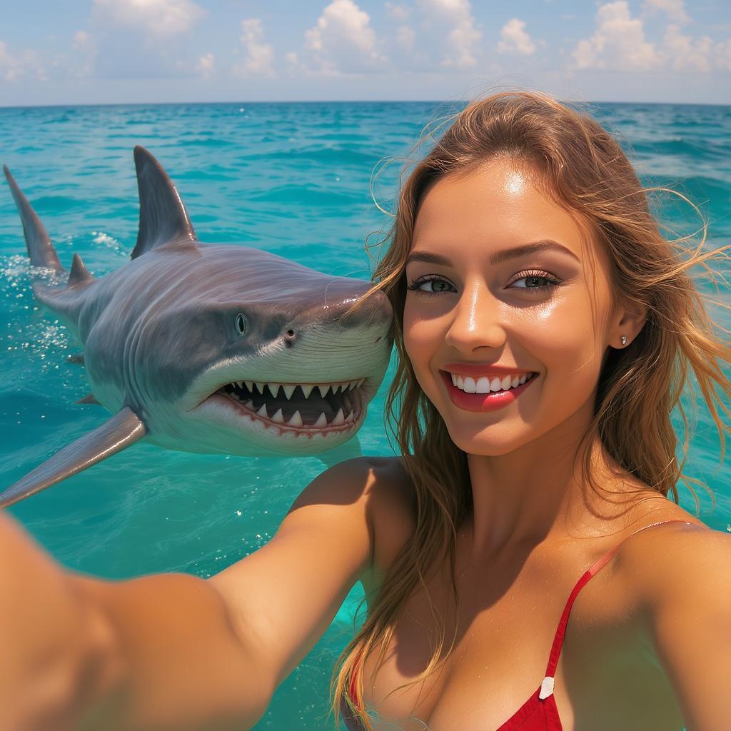 A stunning young woman captures a selfie in a sun-drenched ocean setting, with a peculiar yet mesmerizing mutant shark nearby, its unusual appearance adding a touch of thrill to the scene. Hyperrealistic details bring this cinematic moment to life in 8k resolution, showcasing the playful interaction between beauty and the wild. The sun glimmers off the water, illuminating the unique features of the shark and the woman's bright smile as their worlds momentarily collide in this surreal encounter.