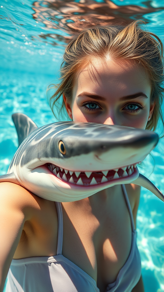 A stunning young woman captures a selfie with a curious yet fierce-looking shark in a vibrant ocean setting on a sunny day, hyperrealistic, detailed 8k resolution, cinematic lighting enhances the scene, the mutant shark features unique, striking patterns and colors, the atmosphere a mix of thrill and beauty, with the shark's sleek, slightly disfigured form adding an element of the extraordinary.