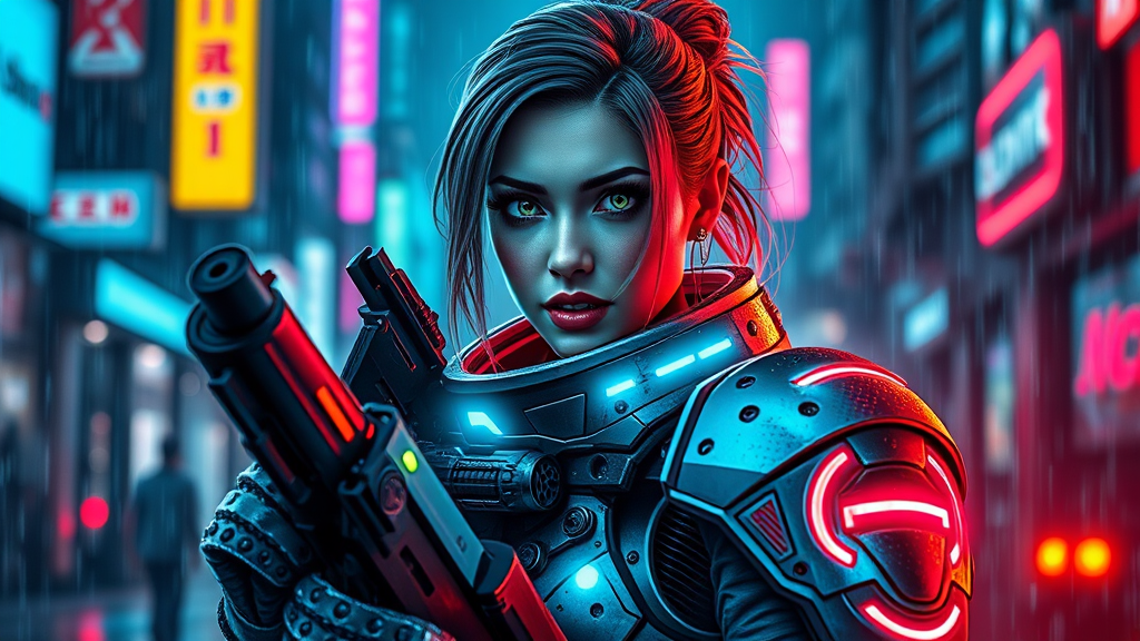 A stunning young woman exuding a goddess-like aura, clad in sci-fi medium armor adorned with vibrant neon lights. Her ethereal white eyes gaze confidently ahead as rain cascades in an urban setting, creating reflective surfaces that enhance the neon glow. She stands in a dynamic, poised posture, her sci-fi laser gun in hand, encapsulating a cyberpunk essence. Her face, perfectly symmetrical, bears a confident smile, reminiscent of a futuristic warrior ready for anything, with intricate details and complex textures highlighting her character. Her dynamic hairstyle, combined with the dramatic effects of lens flares and fog, creates a captivating scene. Inspired by iconic sci-fi elements, such as Star Wars, she sports a futuristic army uniform interwoven with nostalgia. The entire image is rendered in photorealistic detail, emphasizing the realistic portrayal of her skin and the vividness of the HDR effects. The work of art channels the creativity of renowned artists like Artgerm, Greg Rutkowski, and Viktoria Gavrilenko, trending on platforms like ArtStation and CGSociety, and embodies intricate high detail, multiplicity of clones, and a surreal blend of colors.