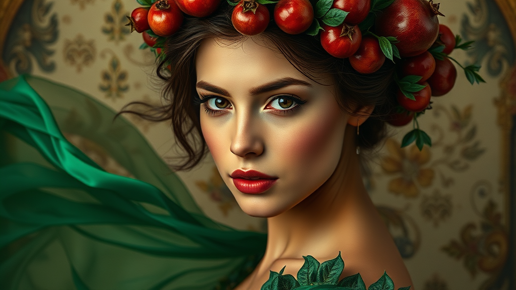 A stunning young woman graces the cover, her enchanting dark eyes drawing you in. She is adorned in an elegant emerald gown that flows gracefully around her, while a whimsical crown crafted from lush pomegranates rests atop her head, adding a touch of mythical allure.