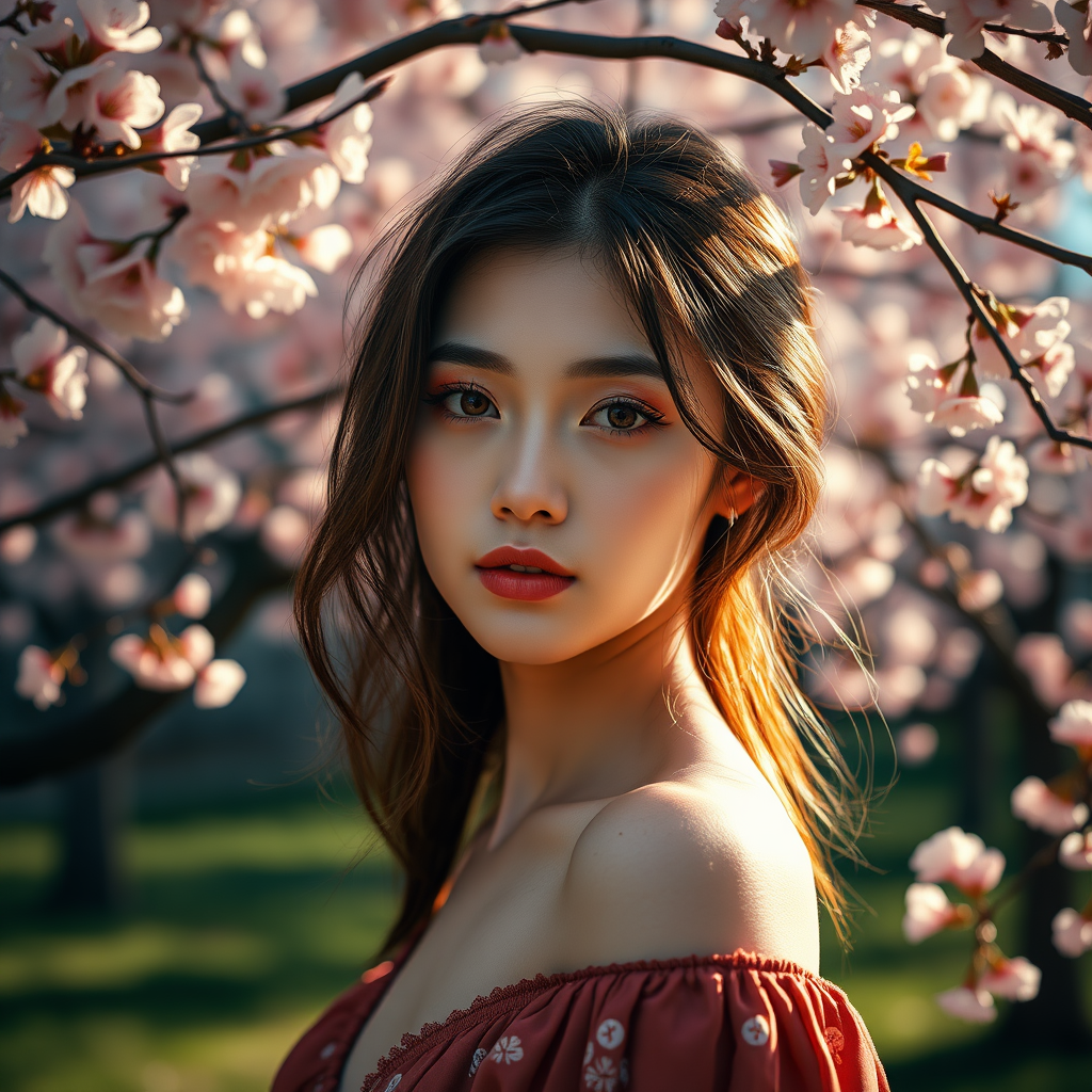 A stunning young woman in a serene outdoor setting adorned with blooming sakura trees, captured in dramatic lighting. This professional, high-detail RAW color photograph showcases a hyper-realistic scene with physics-based rendering akin to 8K CG wallpapers. The rich, vibrant colors are heightened by a hyper-realistic texture, reminiscent of being captured with a f1.6 lens for heightened contrast and depth. The scene exudes realism, leveraging Cinestill 800 for an easynegative approach, alluding to CGI and 3D elements, while maintaining a style influenced by anime and digital illustration. The focus remains on lifelike detail and texture, avoiding abstract or distorted interpretations, instead presenting a flawless portrayal of beauty without any imperfections or irregularities.