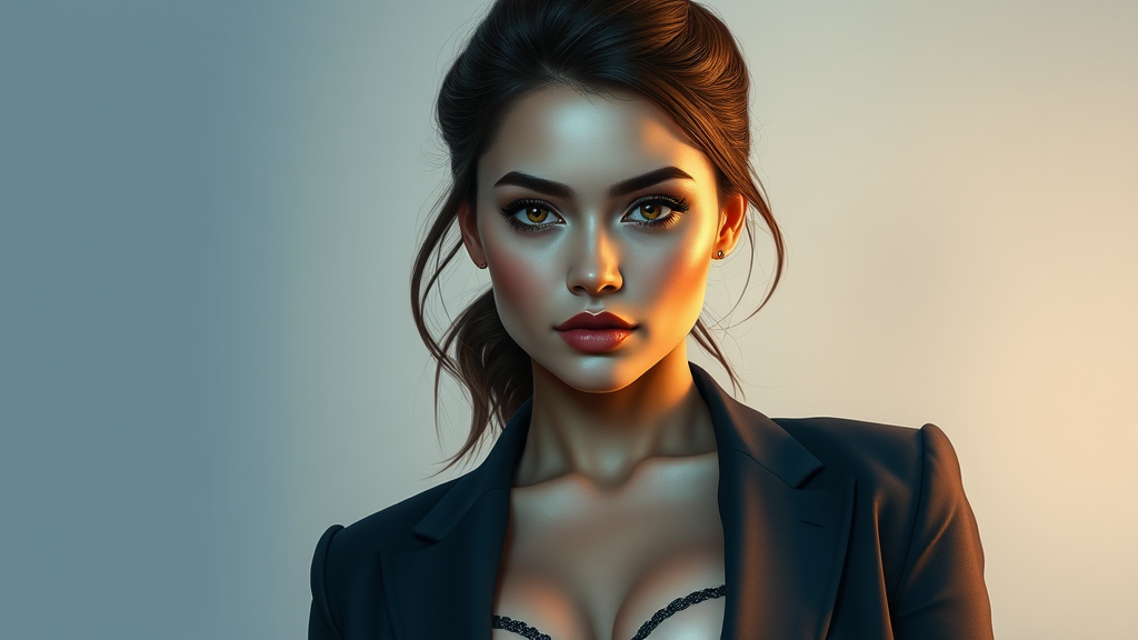 A stunning young woman in an elegant office jacket, her confident gaze complemented by a delicate bra peeking through, depicted in a realistic and meticulously detailed style. The lighting enhances her features with soft, realistically shaded highlights and shadows, capturing the nuance of her expression. Inspired by the artistic brilliance of Greg Rutkowski, Magali Villeneuve, Artgerm, Jeremy Lipkin, Michael Garmash, and Rob Rey, the composition brings together a blend of modern elegance and timeless sophistication, with subtle alterations such as a unique color palette and a slightly abstract background adding a touch of creative flair to the portrait.