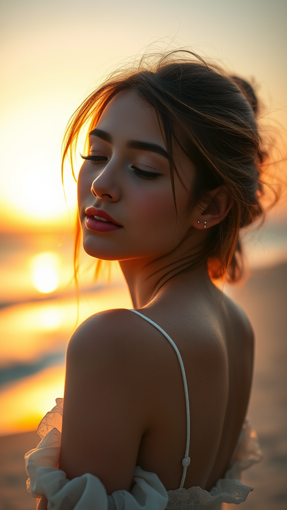 A stunning young woman is captured in an intricate and elegant portrait, exuding a fantasy-like aura with detailed, cinematic lighting that creates a gradient effect. She is in a relaxed pose by the beach at sunset, embodying the serenity of the moment. Her arms are gracefully positioned behind her back, and her cute, delicate face is highlighted with her eyes gently closed, conveying a sense of peace and beauty. The warm tones of the setting sun enhance her features, while the high-resolution quality makes every detail of this masterpiece come to life.