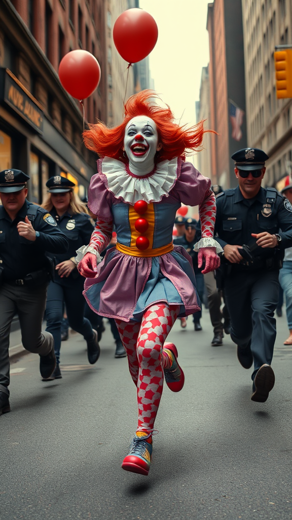 A stunning young woman, resembling a vibrant and alluring version of the iconic Pennywise clown, bursts into hysterical laughter while sprinting through the bustling streets of New York City. Her colorful costume contrasts with the urban backdrop as she evades pursuit by a group of determined police officers. Photorealistic detail captures the surreal and chaotic scene, merging whimsy with the gritty energy of the city.