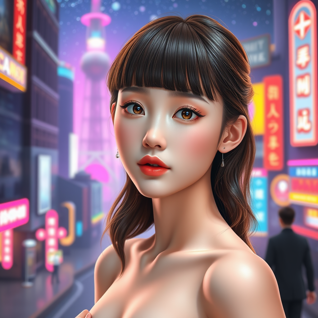 A stunning young woman stands alone, exuding an aura of confidence and allure. Her flat bangs frame a beautiful 3D face with an innocent yet captivating symmetry, reminiscent of a K-pop idol or supermodel. Her eyes possess a mesmerizing glow, like those of a goddess. Her flawless complexion boasts a natural skin texture, glistening with ethereal softness, and her white skin enhances her finely detailed and pretty features. She has a perfect anatomy with a slender waist, medium breasts, and slim legs. Her glossy, shiny hair cascades in luscious waves, complementing her delicate, golden-ratio face. Expressive eyes hold detailed pupils, radiating charm and mystery. She wears natural makeup that highlights her clear face, marked by luscious, glossy lips and a hint of blush. Her graceful hands add to her overall elegance, with perfect proportions evident across her realistic skin texture. She stands confidently against a backdrop of a futuristic cityscape, where cyberpunk aesthetics merge with the grandeur of a starry sky. Neon lights and colorful refractions illuminate the scene, creating an adventurous atmosphere. The world behind her is a vibrant mix of wormholes and machine elements, rich with extremely metal textures. Wind swirls around her, giving motion to her very long hair as she holds a gun with an adventurous look, ready for battle. The setting is a world of science fiction, filled with pixel art details, space warps, and a touch of fog. A sense of movement is enhanced by the Rembrandt lighting, lending a dramatic flair as the elements converge. The scene is vividly alive with the interplay of light and texture in a neon-lit cyber world, full of intrigue and endless possibility.