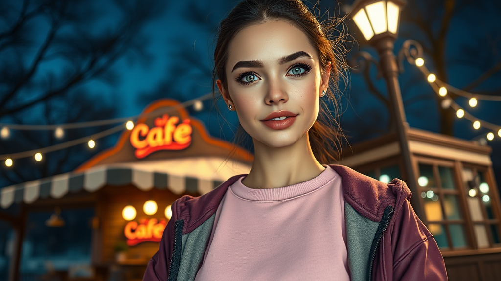 A stunning young woman stands confidently outdoors under a beautifully detailed night sky. Her captivating eyes and meticulously detailed lips are highlighted by professional cinematic lighting that casts a gentle glow across her face. Clad in a pink sweatshirt and white sneakers, she wears a stylish jacket that adds an air of casual sophistication. The scene captures a full-body view as she stands against the backdrop of a charming, intricately designed café. Her gaze meets the viewer's, with the clarity and complexity of her eyes drawing them in. The use of photon mapping and physically-based rendering creates a realistic and immersive atmosphere, while the composition ensures every detail, from her expression to her attire, is presented with striking clarity. This avoids imperfections such as extra or missing limbs, blurry elements, or poorly rendered features, focusing instead on a seamless and aesthetically pleasing portrayal.