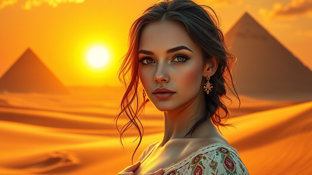 A stunning young woman stands gracefully amid the shifting sands of Ancient Egypt, her flawless face framed by the golden light of the setting sun. The backdrop of ancient pyramids and timeless dunes adds to her ethereal presence. Her elegant pose exudes majesty and mystery, capturing the essence of divine beauty in this fantastical scene. The vibrant colors and intricate details create a masterpiece reminiscent of an exquisite ArtStation illustration. With perfect composition, the image bursts with a sense of timeless allure and captivating fantasy, imbuing the desert landscape with enchantment and intrigue.
