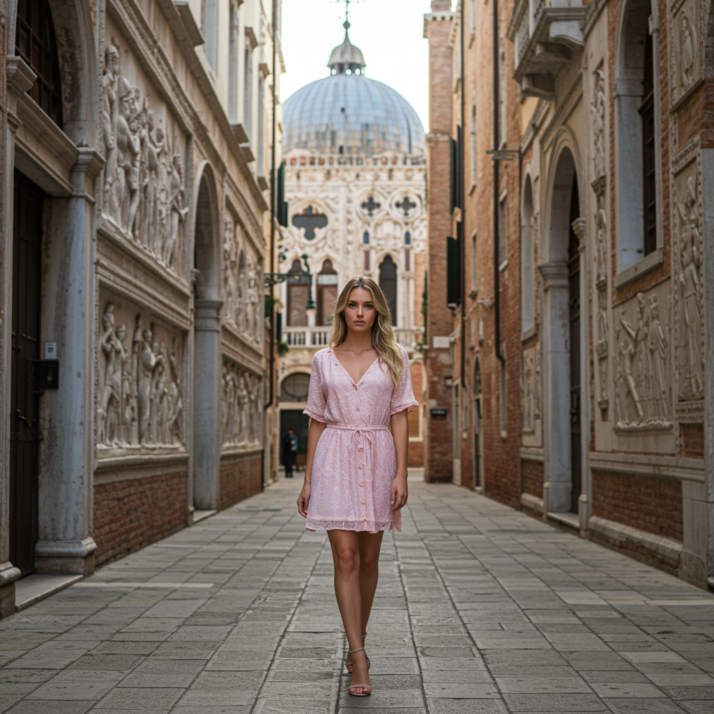 A stunning young woman steps into a historic Venetian alleyway in the 16th century, surrounded by majestic architecture adorned with intricate reliefs. Captured in wide angle, the scene showcases her detailed, lifelike features against the backdrop of ornate buildings. Soft backlighting casts a gentle glow, highlighting the pastel hues of her attire and the finely detailed textures of the environment, all rendered in exquisite 8k quality.