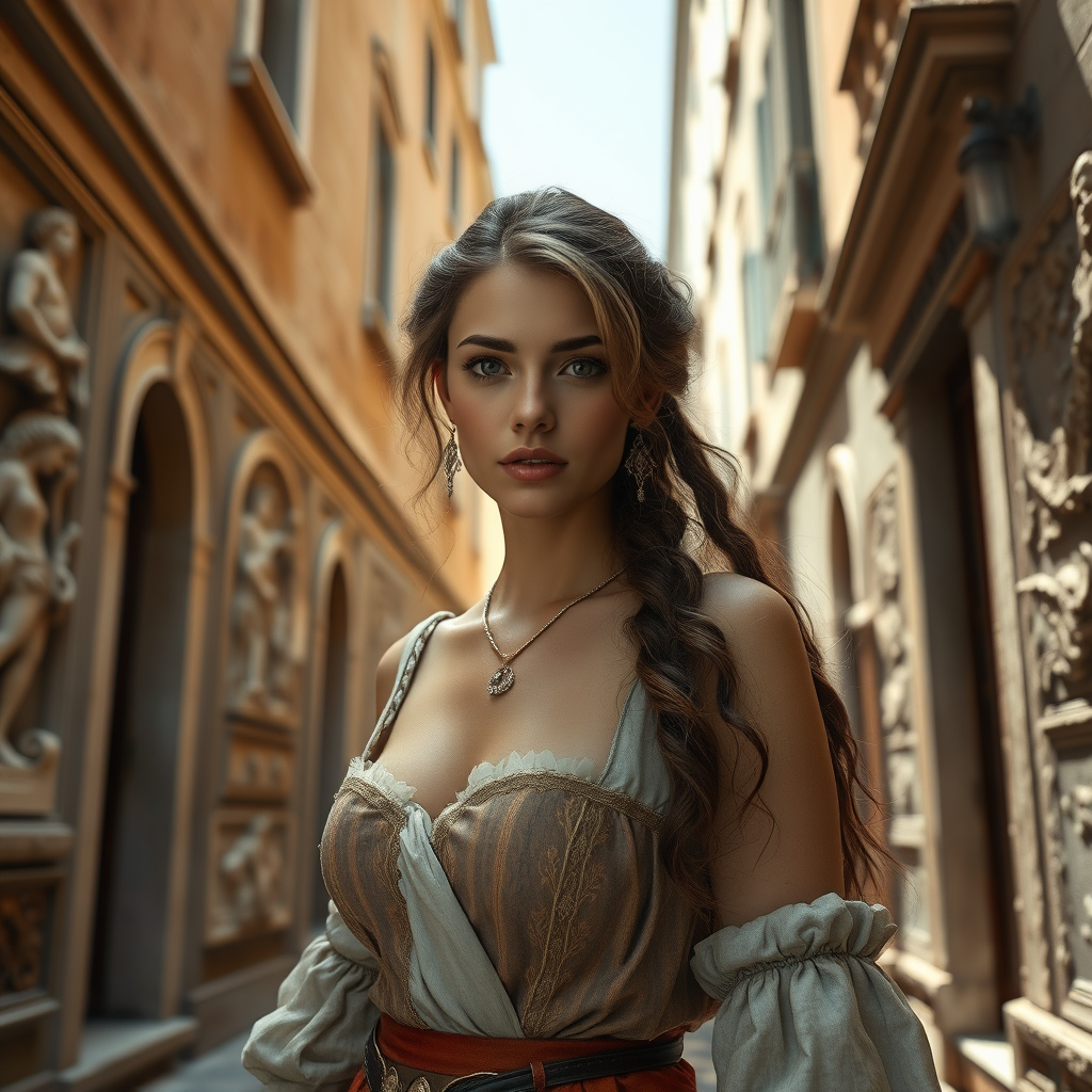 A stunning young woman steps into a narrow, timeworn alley in 16th century Venice, surrounded by grand architecture adorned with intricate reliefs. The scene is captured in a wide-angle mastershot that highlights the detailed artistry and opulence of the era. Her face is remarkably expressive, and her anatomy is portrayed with realistic precision. The atmosphere is enriched with soft pastels and gentle backlighting, enhancing the visual splendor, akin to an 8k art masterpiece.
