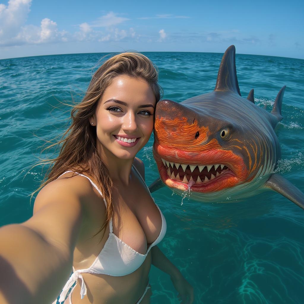 A stunning young woman takes a selfie with a curious, unusually large shark in a bright and sunny ocean setting, hyperrealistic detail, 8k resolution, cinematic lighting casting dramatic shadows across the scene, featuring a unique, slightly mutated shark with unusually vibrant, swirling patterns on its skin, exuding both wonder and a touch of mystery as the creature emerges from the water.