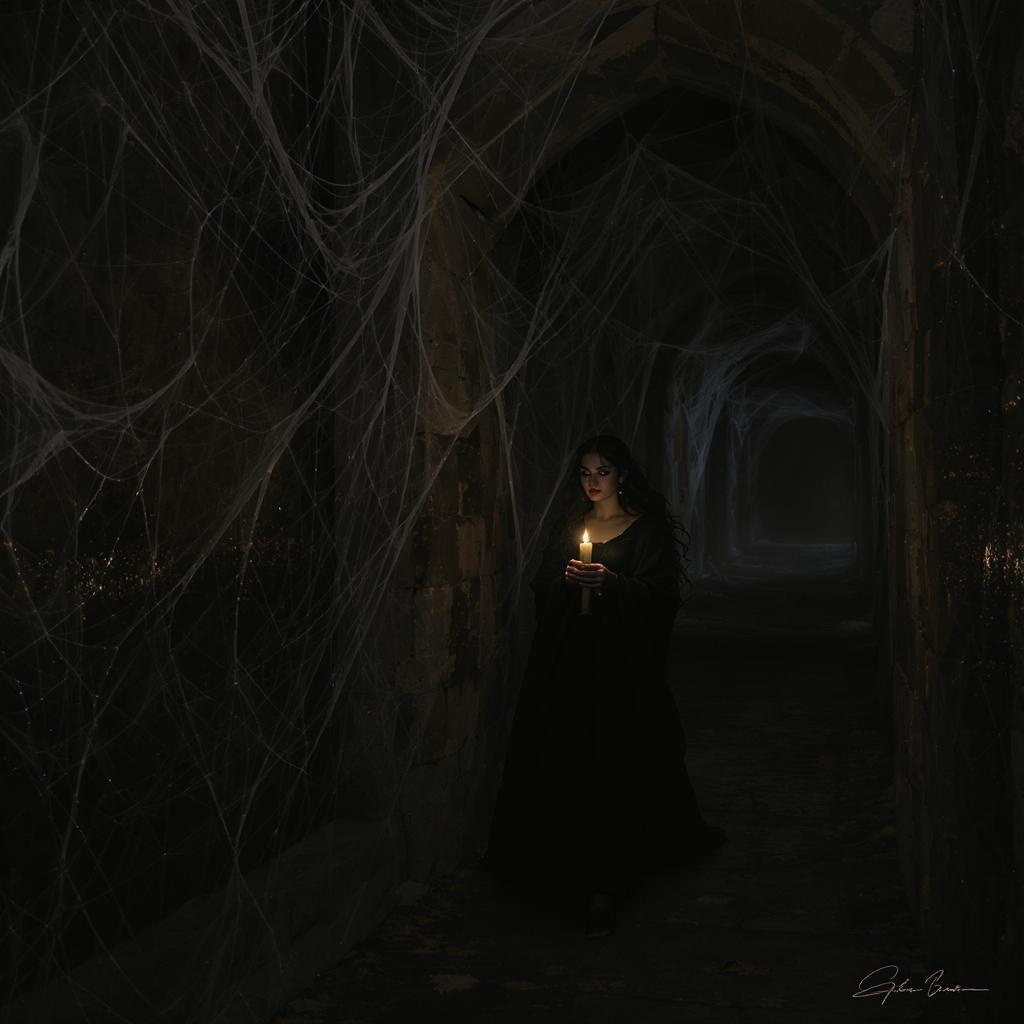 A stunning young woman wanders through the dimly lit corridors of a foreboding ancient castle, her delicate features illuminated by the soft glow of a flickering candle she clutches tightly. The air is thick with mystery as her footsteps echo against stone walls adorned with intricate cobwebs shimmering in the shadows. Her eyes, wide with both wonder and apprehension, scan the vast tapestry of history woven into every corner of the castle. As she ventures deeper, the candlelight casts dance-like shadows that seem to whisper secrets of the past, creating an enchanting yet eerie atmosphere that envelops her in its dark embrace.