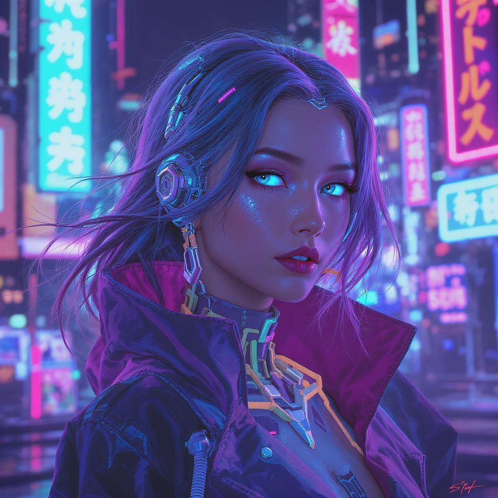 A stunning young woman with a cybernetic appearance set within a vibrant cyberpunk world. Her exquisite and detailed face is framed by flowing hair, capturing the essence of a vaporwave aesthetic. The art embodies a blend of synthwave influences, creating a digital painting that would sit proudly on ArtStation. It is reminiscent of the styles of Artgerm, Greg Rutkowski, and Alphonse Mucha, focusing on smooth lines and sharp focus. Maintaining the allure of concept art, the illustration avoids any distortions or errors, staying clear of low resolution or artifacts, and avoiding extra limbs or malformed features. Her presence is a seamless fusion of beauty and futurism, with proportions and anatomy elegantly rendered.