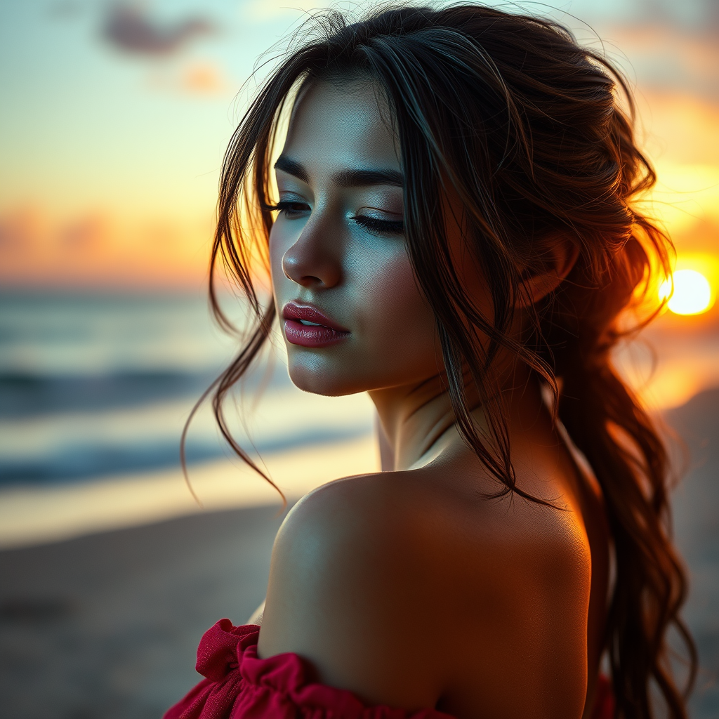 A stunning young woman with an intricate and elegant appearance stands in a fantasy setting. She is positioned like a cowgirl, with her arms gracefully behind her back, highlighting her cute and finely detailed face. The cinematic lighting and gradient hues create a mesmerizing atmosphere around her. The scene captures the warm glow of a sunset on a serene beach, with her eyes gently closed, adding a sense of tranquility to the portrait. This image embodies a masterpiece quality with ultra high-resolution details.