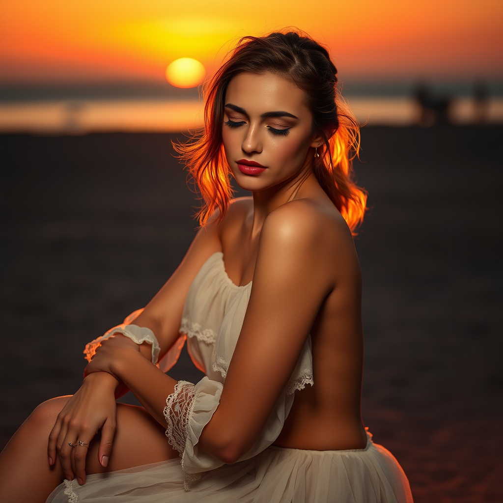 A stunning young woman with an intricate and elegant appearance poses artfully, seated in a graceful manner evocative of a cowgirl, with her arms gently resting behind her back. She has a cute and finely detailed face, illuminated by cinematic and gradient lighting that enhances her features. Her eyes are softly closed, creating a serene expression, while the warm hues of a sunset cast a captivating glow over her figure. Set against the tranquil backdrop of a beach, the portrait captures the essence of a serene and magical moment. The scene is captured with the highest quality, achieving a masterpiece in ultra high-resolution.