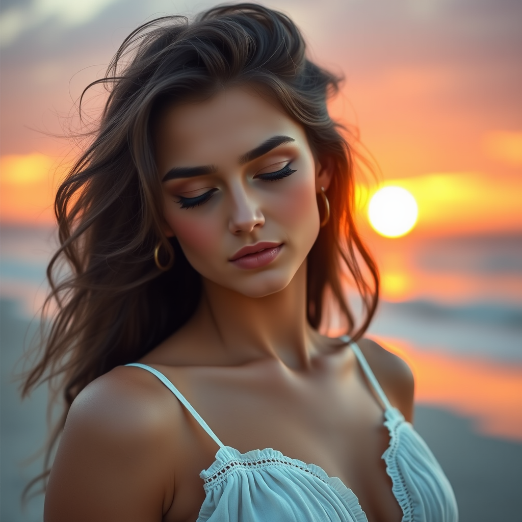 A stunning young woman with an intricate and elegant presence, capturing a fantasy-like vibe with her detailed features, stands with cinematic and gradient lighting. Positioned like a cowgirl, her arms are gracefully placed behind her back. She has a cute and finely sculpted face, her eyes gently closed, basking in the warmth of the sunset on a serene beach. This portrait embodies the essence of best quality craftsmanship, a true masterpiece rendered in ultra high resolution.