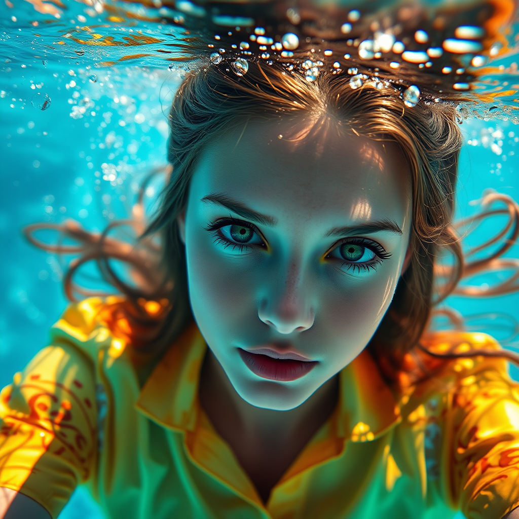 A stunning young woman with captivating green eyes and long, delicate eyelashes gracefully swims beneath the surface. The surrounding water sparkles like crystal, capturing the play of light. Her shirt radiates a dazzling array of light blue, golden yellow, and sunset orange hues, creating a vibrant, hyper-realistic scene. The photograph captures intricate details in ultra-high resolution, offering a professional, immersive visual experience.
