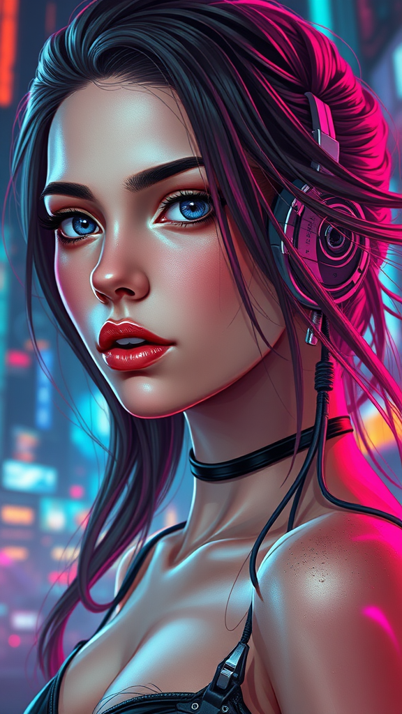 A stunning young woman with cybernetic features set in a vibrant cyberpunk world; her detailed, gorgeous face framed by flowing hair. The scene is infused with vaporwave and synthwave aesthetics, reminiscent of digital paintings seen on ArtStation. This concept art, inspired by renowned artists like Artgerm, Greg Rutkowski, and Alphonse Mucha, features a smooth, sharply focused illustration with hints of neon hues and intricate details. Despite this beauty, the artwork includes intentional digital errors: text glitches, poor quality elements, and portions appear cropped, creating a juxtaposition of elegance and digital decay. The depiction carries subtle imperfections—such as deformed anatomy, extra or missing limbs, disfigured and cloned facial features—evoking a sense of the uncanny within a futuristic landscape.