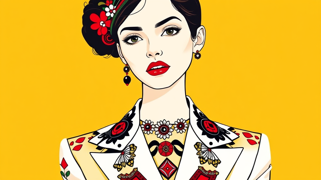 A stunning young woman with delicate features and pale white skin, dressed in a chic fashion suit adorned with vibrant and intricate embellishments, showcasing geometric patterns and designs. The minimalist style of illustration is set against a bold Chelsea Yellow background, with the color palette primarily featuring Chelsea Yellow, white, black, and red. The artwork is a flat minimalist fashion illustration inspired by Memphis design, capturing a modern and playful aesthetic.