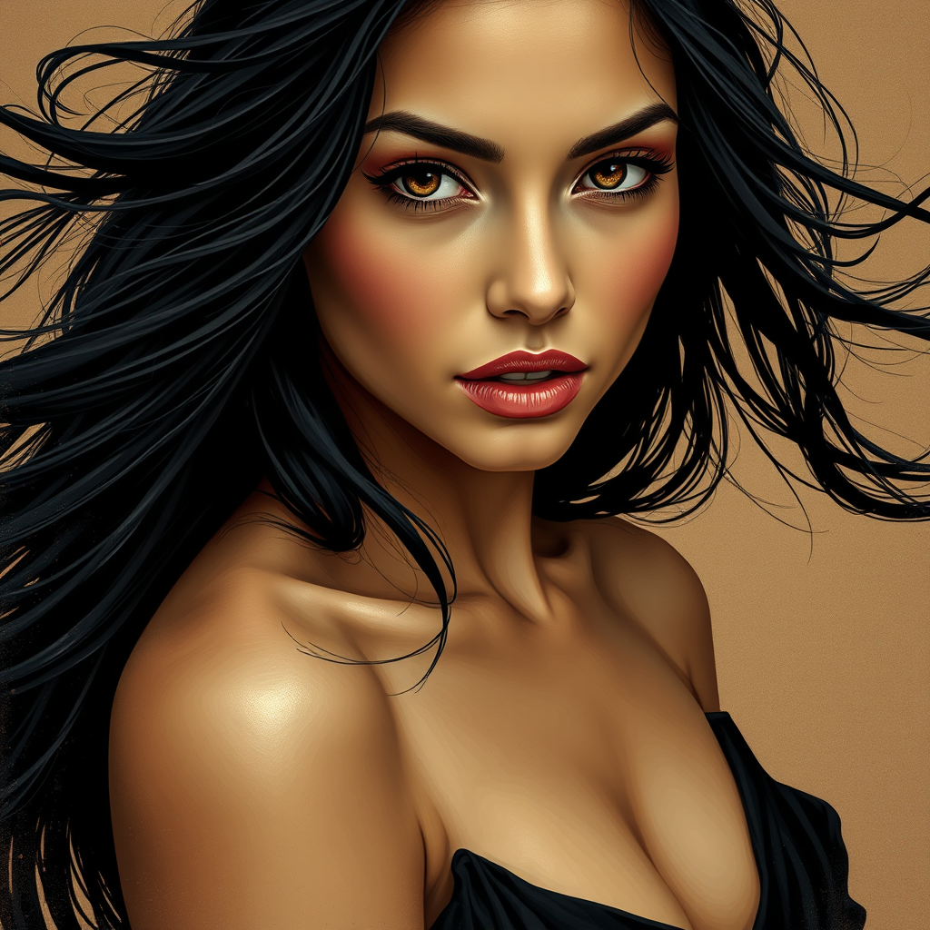 A stunning young woman with flowing dark hair, dressed in shades of ebony, portrayed in a blend of textural layers. Her captivating gaze is rendered in a palette of light browns and subtle blacks, enhanced by wet-on-wet blending techniques. The image reflects wavy, reef-like motions, evoking pop art inspiration with a dash of modern mystique. The aspect ratio is 74:97, and the style is set to a high level of 750, creating an engaging visual allure.