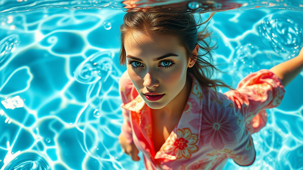 A stunning young woman with mesmerizing green eyes and elegantly long eyelashes glides effortlessly through the crystal-clear water. The liquid around her glistens and refracts light as if made of the finest glass. Her shirt, a kaleidoscope of shimmering blues, sunlit yellows, and soft coral pinks, dances with vibrant hues in the play of light. The scene is captured with hyper-realistic precision, every detail presented in stunning high resolution, rendering it a professional photograph of exceptional clarity and color.
