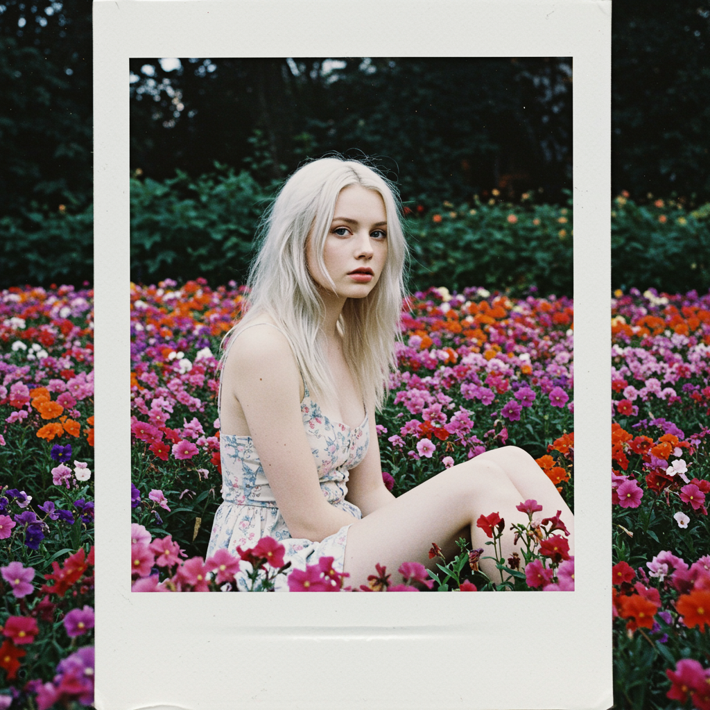 A stunning young woman with platinum blonde hair is captured in a disposable photograph, sitting gracefully amidst a vibrant flower bed. The scene is photo-realistic and showcases the vivid details of the colorful blooms surrounding her. The soft light highlights her delicate features and ethereal beauty, creating an enchanting and serene atmosphere.