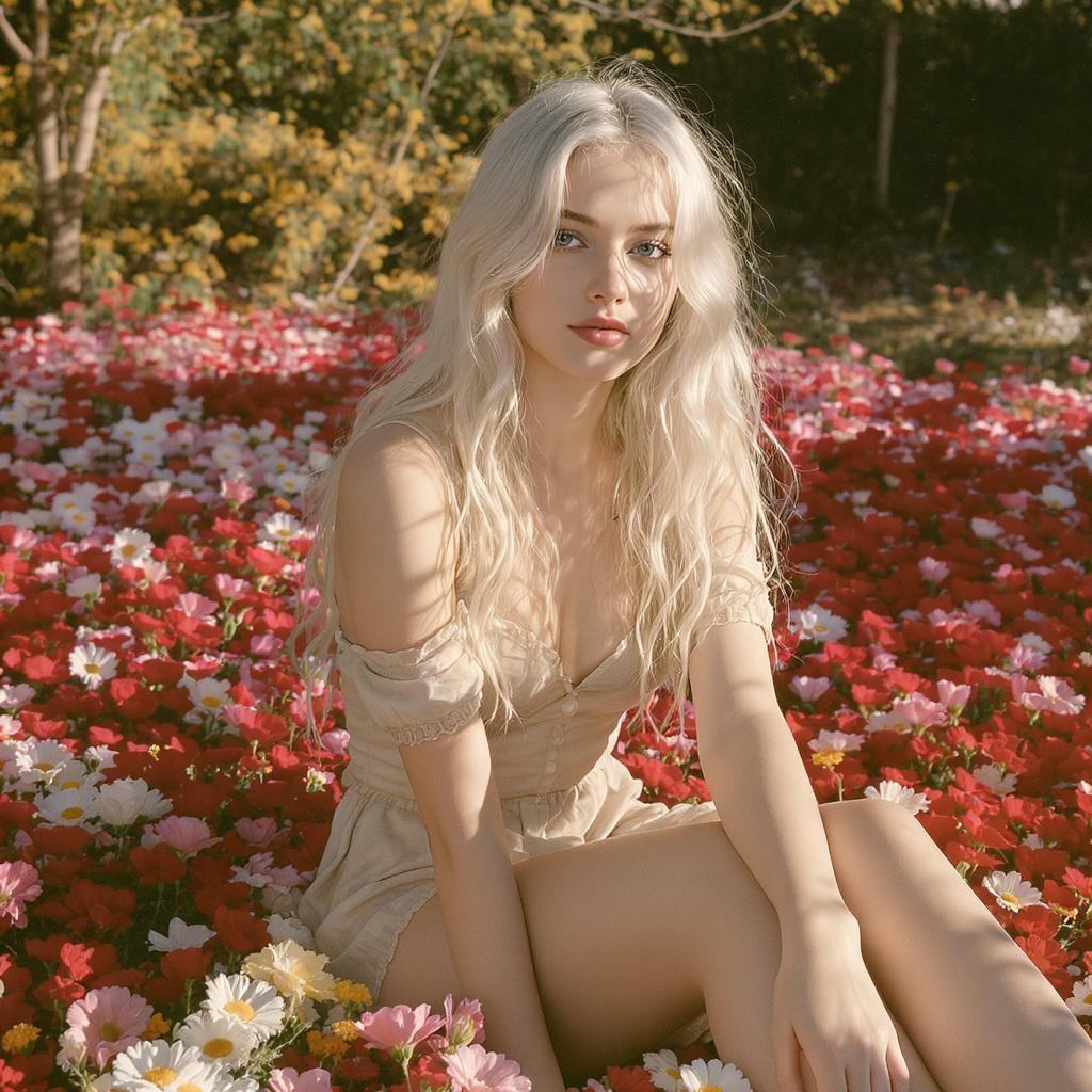 A stunning young woman with platinum blonde hair sits gracefully on a vibrant bed of flowers. Captured in disposable photography style, her serene presence is highlighted by the colorful blooms that surround her. The high-resolution detail showcases her ethereal beauty, blending photo realism with a touch of dreamy softness, as sunlight filters through the petals, casting gentle shadows across her face.