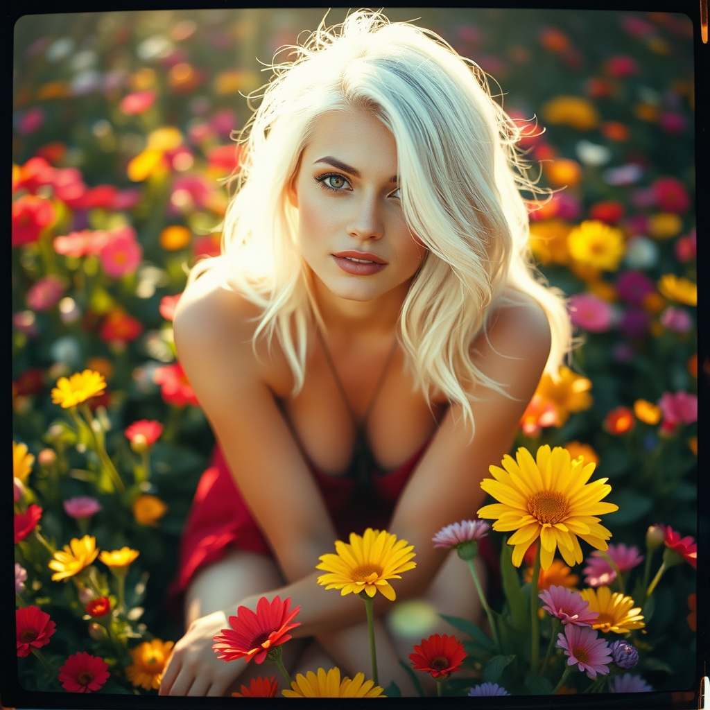 A stunning young woman with silvery white hair sits gracefully on a lush bed of colorful flowers, the sunlight gently illuminating her serene expression. Captured with a vintage disposable camera effect, every detail of this photorealistic scene comes to life, highlighting the vibrant colors and natural beauty surrounding her.