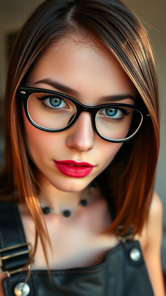 A stunning young woman with straight brown hair captures a selfie portrait, showcasing her mesmerizing dark blue eyes through stylish glasses. Her pink lipstick accentuates her beautifully shaped yet chapped lips, and her face is sprinkled with freckles that complement her perfectly thin nose. Dressed in chic leather overalls, she stands against the soft glow of early morning light. Captured with a 1.4mm lens, the focus is sharp, emphasizing her captivating eyes. Despite some minor imperfections in color and composition, the portrait radiates charm, with subtle, creative touches that enhance her distinctive allure.