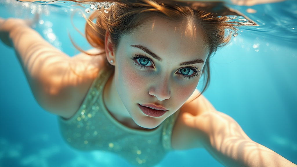 A stunning young woman with striking green eyes and long, fluttering eyelashes gracefully swims beneath the surface. The water envelops her like liquid crystal, shimmering and reflecting light in the most mesmerizing way. Her top glistens with a spectrum of light blue, gold, and soft coral hues, capturing the essence of a vibrant, hyper-realistic photograph. Every minute detail is rendered in exquisite high-resolution, creating a professional image that encapsulates the beauty and serenity of the underwater world.