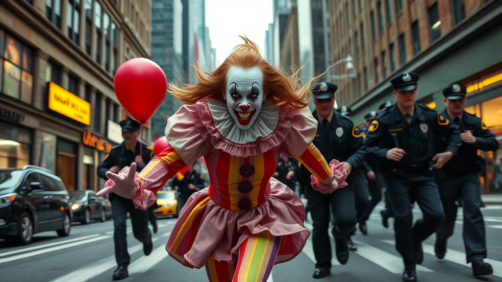 A stunning young woman with the iconic Pennywise clown makeup, her eyes alight with mischievous laughter, sprinting down a bustling New York street. Her vibrant, multicolored ensemble flares in the wind as the city's energy pulses around her. Behind her, a group of determined police officers give chase, their expressions a mix of confusion and determination. The scene captures the surreal blend of chaos and comedy, set against the backdrop of towering skyscrapers and neon lights in a moment of thrilling, photorealistic detail.