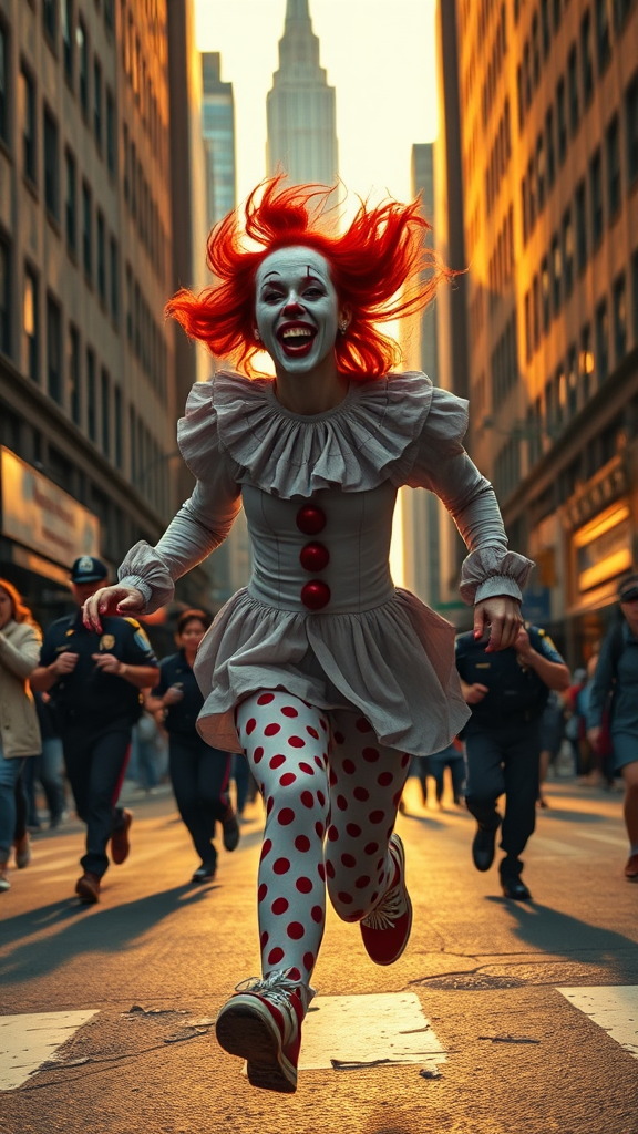 A stunning young woman with vibrant red hair styled like Pennywise, laughter echoing in the air, dashes through a bustling New York street, her joy infectious yet unsettling. Her painted face, a haunting blend of beauty and horror, captures the attention of startled onlookers. As she runs, her hysterical laughter rings out, a stark contrast to the urgency in the footsteps of the police officers pursuing her. The setting sun casts long shadows, heightening the surreal atmosphere. In this photorealistic scene, the city becomes a backdrop for a bizarre and thrilling chase, blending reality with a touch of cinematic fantasy.