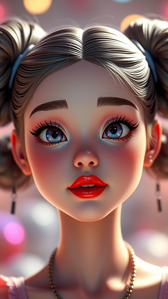 A stunningly adorable woman with playful top knots brimming with lively energy, featuring intricately delicate iridescent details and vibrant red lipstick. The scene is illuminated globally, showcasing an ultra-detailed Pixar and Disney-inspired 3D character art by Artgerm. Her face is hyper-detailed with clear, realistic eyes maintained in sharp focus. The rendering employs octane and ray tracing techniques, presented in Ultra-High-Definition, 8k, and HDR. Incorporating the essence of a Dark Sushi Mix model, her features include a balanced face design. Overall, the visual presents a sharp, detailed representation without unintended alterations like cross eyes, extra fingers, or mutations. This portrayal maintains high clarity, avoiding cropped elements, low resolution, artifacts, or any form of textual distractions, ensuring a pure, immersive visual experience.