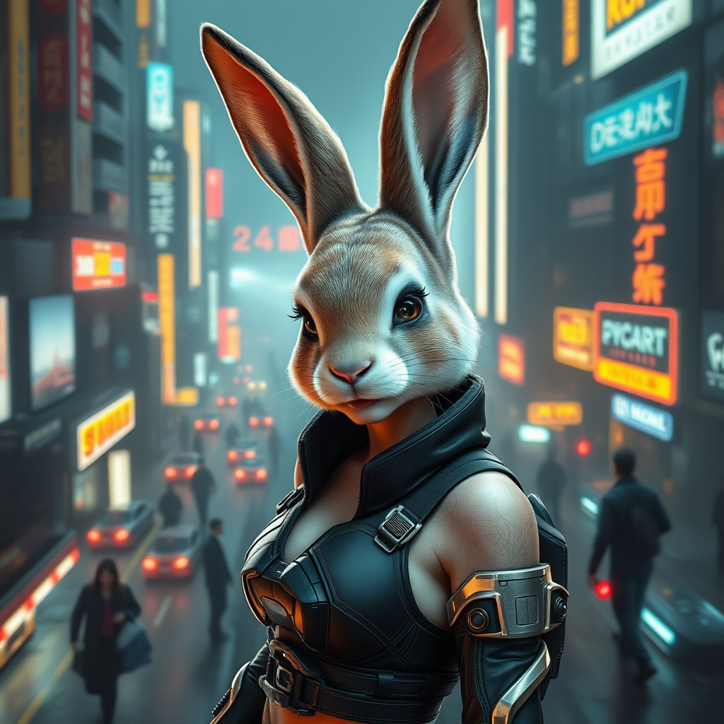 A stunningly attractive 25-year-old humanoid rabbit in a cyberpunk dystopian future, showcasing a perfect blend of dark and cute aesthetics. The rabbit is styled as an alluring pinup character with sleek, futuristic clothing and a rocket-themed motif. Set against a beautifully detailed dystopian cityscape, the landscape is bustling with neon lights and advanced technology. Enhanced with masterful studio lighting, the scene captures the rabbit with exquisite detail, highlighting its captivating charm and the gritty, busy atmosphere of the future world.