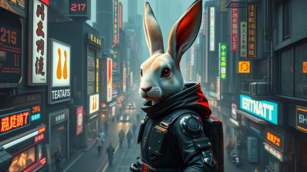 A stunningly attractive 25-year-old humanoid rabbit with cyberpunk aesthetics, set against a dystopian dark future backdrop. This masterwork pinup poster features the rabbit as a rocket-powered figure, posed elegantly amidst a beautifully detailed and bustling landscape. The scene is illuminated with perfect studio lighting, highlighting the intricate designs and grimdark allure of the environment. The humanoid rabbit embodies a blend of cute and edgy vibes, with sleek, futuristic attire, and an air of mystery and allure. The composition captures the essence of a busy, tech-driven world, rich with vibrant details and a sophisticated dystopian charm.