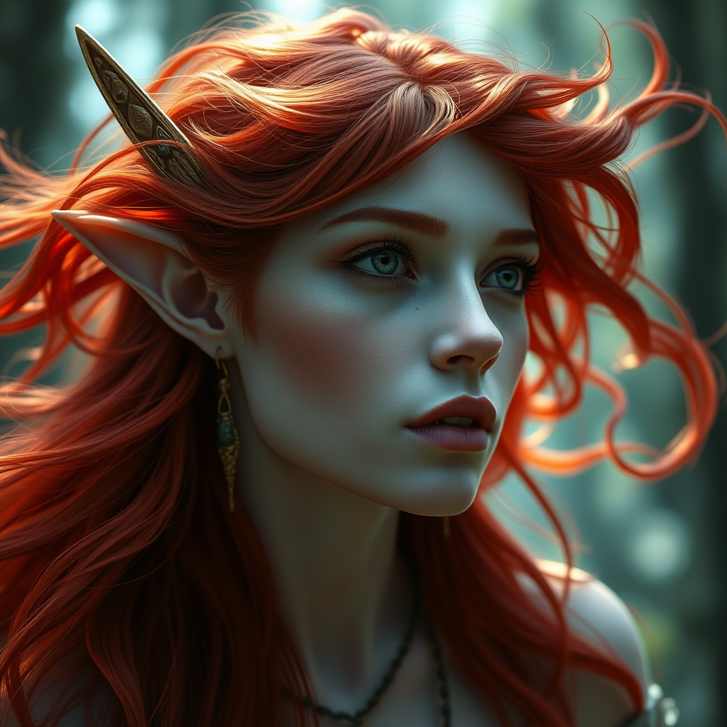 A stunningly beautiful forest elf goddess with flowing red hair and luminous pale skin, showcasing intricate facial details under ethereal and cinematic lighting. Her presence is captured in a hyper-realistic style with inkpunk influences, utilizing ray tracing and smooth, sharp focus. The scene resembles a detailed 3D render made with octane render at 8k resolution, enhanced by VFX, creating a soft, dreamlike atmosphere that suggests the artistic influence of Alphons Mucha.