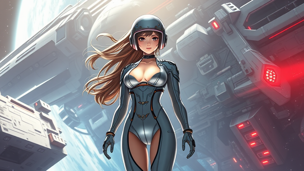 A stunningly beautiful girl in a sleek spacesuit stands gracefully against the backdrop of a massive, hyper-detailed sci-fi spaceship, evocative of Tsutomu Nihei's epic style, reminiscent of Sidonia no Kishi. Her hair flows dynamically, lit cinematically to highlight her features. A luminous glow emanates from her chest, accentuated by a high-tech helmet and intricate piercings. The attention to detail is palpable, with headphones over her bare neck and sleek heels adding to her futuristic allure. Her lean physique is accentuated by narrow hips and gold rivets, all under a dramatic, almost blinding light that enhances the scene's symmetry. The visual coherence rejects any distorted anatomy or flaws, embracing only clarity and elegance, avoiding unwanted elements or deformities that could distract from her exquisite form. The overall composition embodies a clean, vivid aesthetic with vibrant yet balanced hues, creating a powerful, mesmerizing image without imperfections such as watermark or oversaturation. Her eyes are sharp and lively, completing the captivating character set in a vast, intricate cosmic expanse.