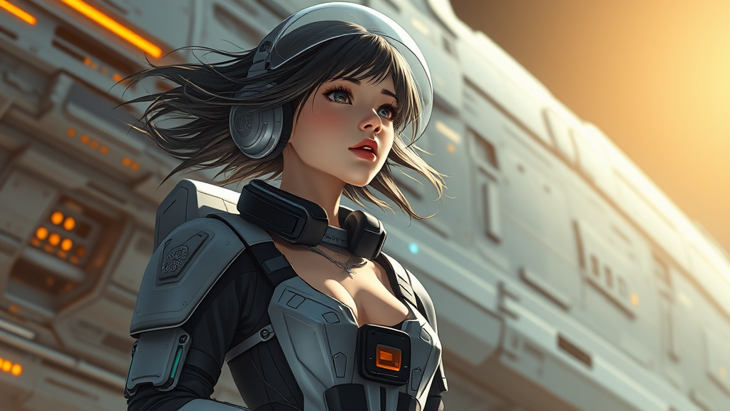 A stunningly beautiful girl in a sleek spacesuit stands against the backdrop of a giant, hyper-detailed, and minimalist epic spaceship. Her appearance is influenced by the artistic style of Tsutomu Nihei, reminiscent of "Sidonia no Kishi," showcasing a sci-fi aesthetic with a focus on clarity and detail. Cinematic lighting adds drama to the scene as her hair dynamically waves in zero gravity. Her spacesuit, adorned with glowing patterns, includes a helmet, piercings, and a light on the chest. Her headphones rest on her bare neck, accentuating her slender form. The scene is bathed in bright, golden light that creates a captivating ambiance. Despite her futuristic attire, she maintains a sense of symmetry and balance. Avoid any imperfections such as bad anatomy, extra limbs, or distorted features, ensuring she retains her stunning allure.